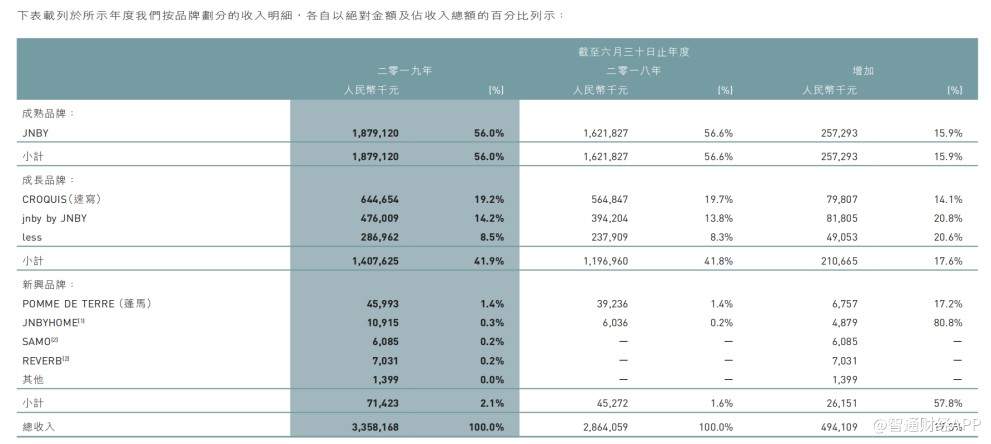 2018/19财年,JNBY品牌为江南布衣贡献了18.79亿元营收,占公司总收入的56%,三个成长品牌共计贡献收入14.08亿元,占公司总收入41.9%。