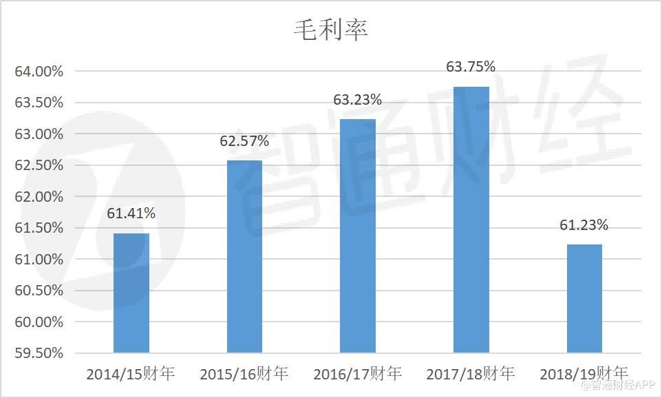 由于自营门店占比下滑,江南布衣2018/19财年毛利率下降至61.23%,同比下降2.52个百分点,为近五个财年最低水平。