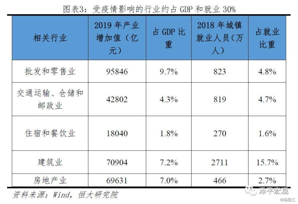 疫情对人员密集接触、难以线上转移的行业产生冲击,包括餐饮行业、酒店旅游、影视娱乐、零售、交通运输、房地产及建筑等行业,约占GDP和就业的30%。这些行业关系人民群众生活,中小企业众多,是吸纳就业的重要领域,一旦出现倒闭潮,将传导至就业、民生大局。