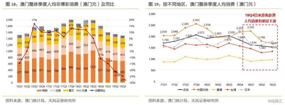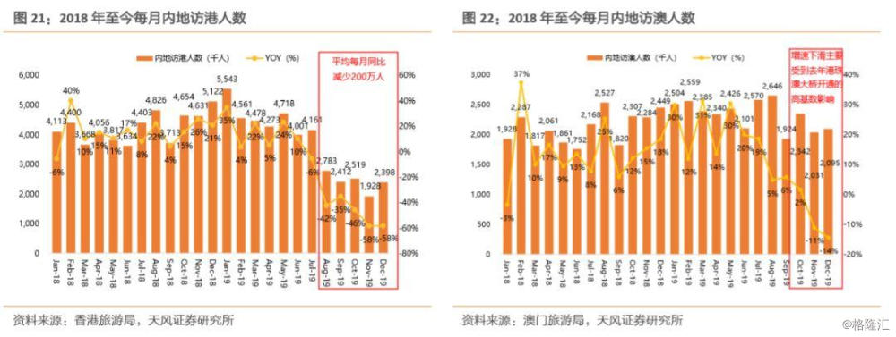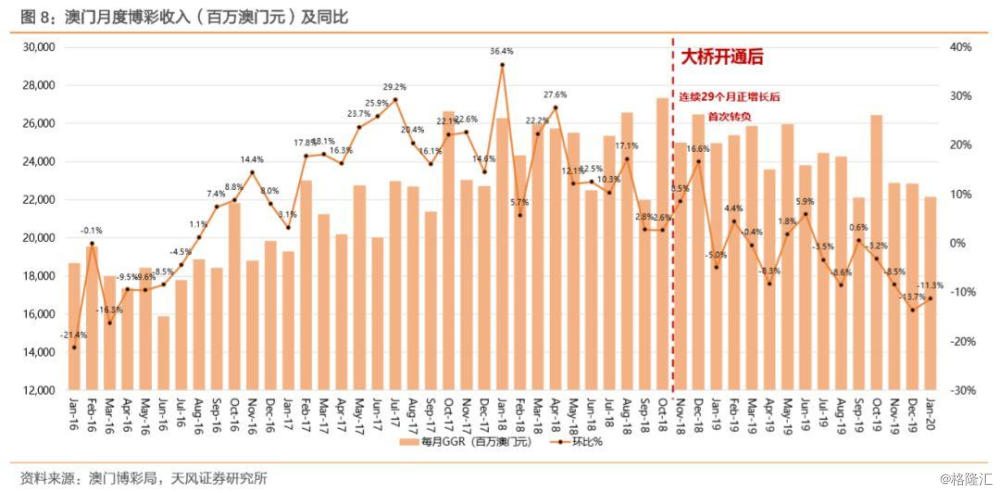 港股上市永利澳门(1128.HK)的美股母公司永利度假(WYNN.US)早前公布 Q4 业绩。当中澳门业务Q4 博彩毛收入为12.39 亿美元,同比跌 21%,VIP营收同比跌39%,中场营收同比涨5%,三项均低于行业平均水平(行业总博彩收入+8%,VIP -23%,中场+9%)。针对疫情,永利表示目前较难估计娱乐场何时能重开。澳门政府早前暂停所有41家娱乐场营业两周到2月20号,但近日又表示须根据澳门本地以及内地疫情发展,再决定重开日期。目前永利一天的运营成本为2.4-2.6百万美元,当中1.8-1.9百万美元为员工工资。我们测算关停15天可能对公司20年营收造成4%左右影响。