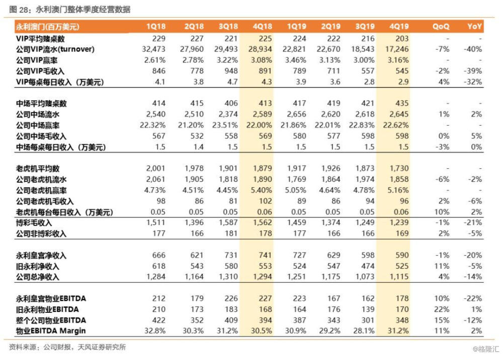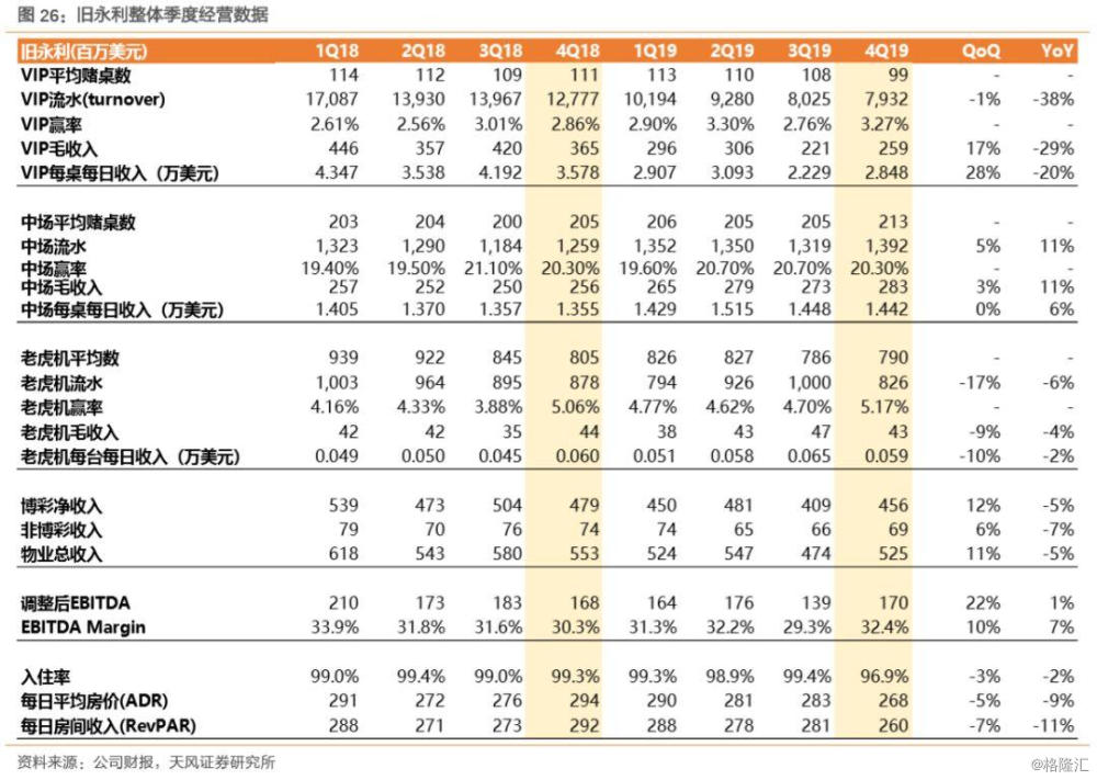 依靠港珠澳大桥效应,澳门半岛旧永利的中场表现虽较佳,但VIP继续展示疲态。旧永利中场营收同比涨11%,受益于11月中装修重开的西翼(含44张赌桌)。VIP方面,Q4赢率偏高(3.27% vs 18Q4 2.86%),因此流水同比虽大跌38%,但收入同比跌幅为29%。路氹永利皇宫中场赢率偏高(25.2% vs 18Q4 23.6%),故中场流水同比跌6%,但收入涨1%。VIP流水和收入分别-42%和-46%,跌幅较Q3扩大,显示路氹地区竞争愈发激烈,VIP分流明显。