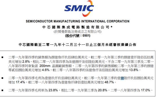 2月13日消息,中芯国际(00981.HK)发布第四季度业绩公告,第四季度公司营收为8.39亿美元,去年同期7.88亿美元。公司第四季度毛利率23.8%,2018年第四季度毛利率为17%。