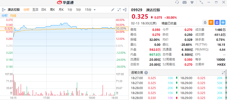 华盛资讯2月13日讯, 澳门的机电工程商澳达控股暗盘收盘涨30%,最新总市值6.5亿港元,成交额481万港元,不计手续费一手赚750港元。