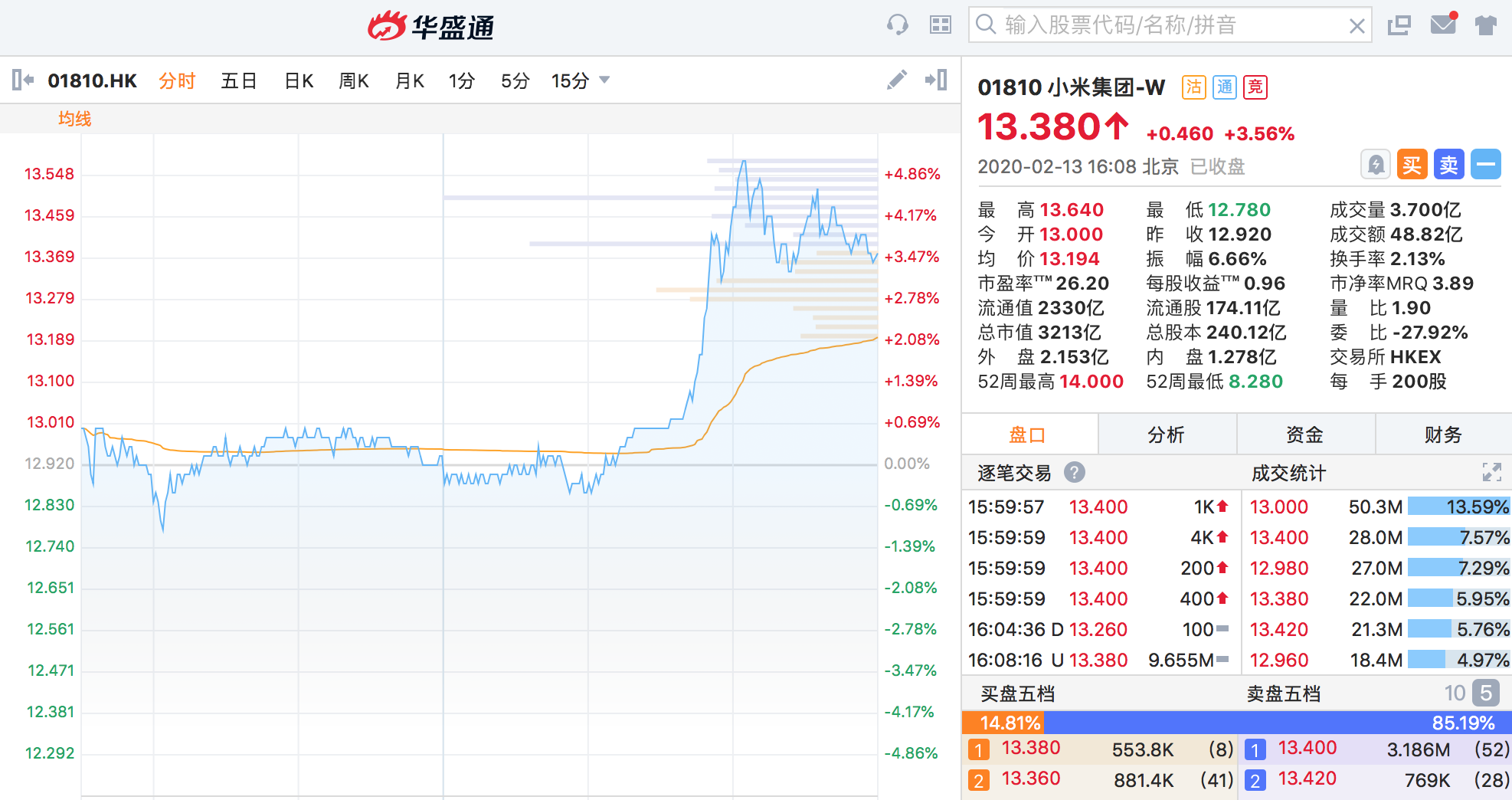 雷军表示,小米手机要正式冲击高端市场,打破价格的限制。话音一落,市场也开始投票,小米股价由跌转涨,大幅走高,午后一度涨逾5%,最终收涨3.56%,市值增加了110.46亿港元。值得注意的是,内资日前已经累计买入11.8亿股,持股6.78%,平均浮盈24%。