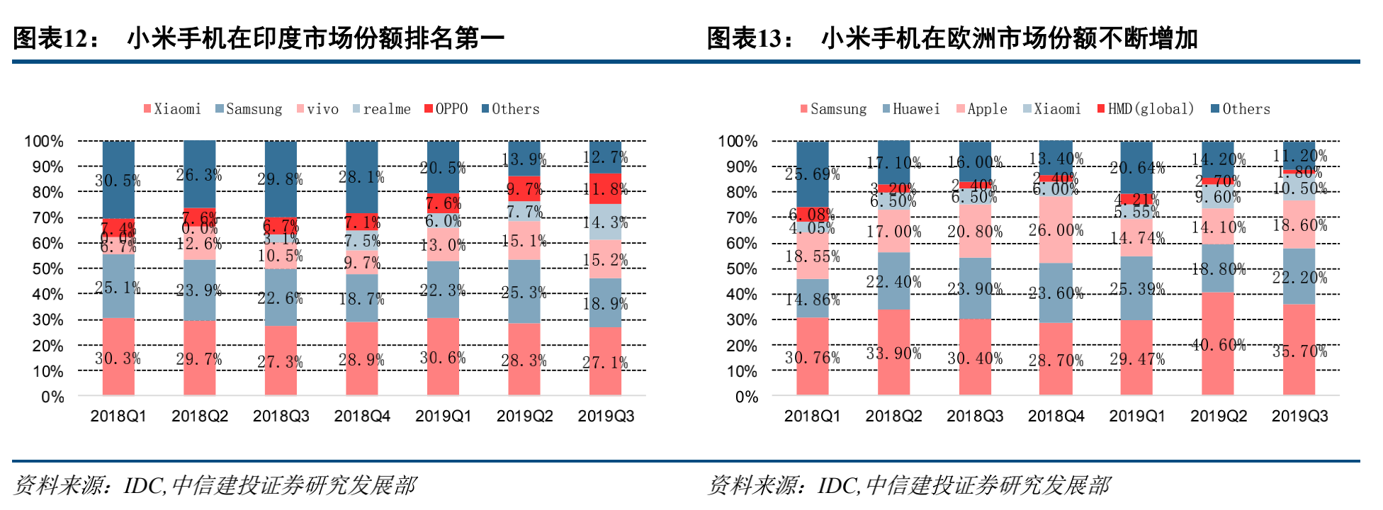 事实上,2019年四季度,小米国内手机销量份额占到9.5%,相对三季度9.0%的份额,确有触底反弹的迹象。而在全球市场,小米同期手机销量份额占比9.0%,较三季度的9.2%也基本持平,细分到欧洲市场,小米的份额更是上升至14.2%,排在第4位,仅次于华为的16.4%,同时在印度市场,份额占比29%,继续排名第一。