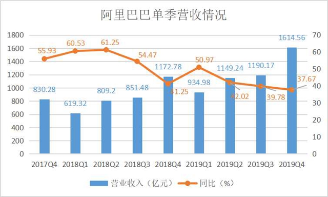 2月13日晚间,阿里巴巴发布了截至2019年12月31日止的2020财年第三财季报告,公司实现营业收入较上年同期增长38%,至1614.56亿元;非公认会计准则净利润同比增长 56%至 464.93 亿元。