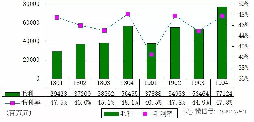 阿里巴巴2019年第四季度毛利771.24亿元,毛利率为47.8%,上一季度为44.9%,上年同期为48.1%。