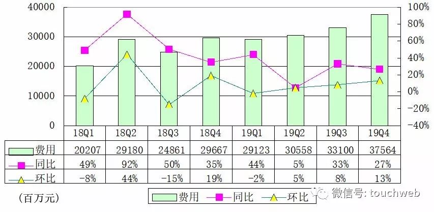 阿里巴巴2019年第四季费用375.64亿,较上年同期的296.67亿元增长27%。
