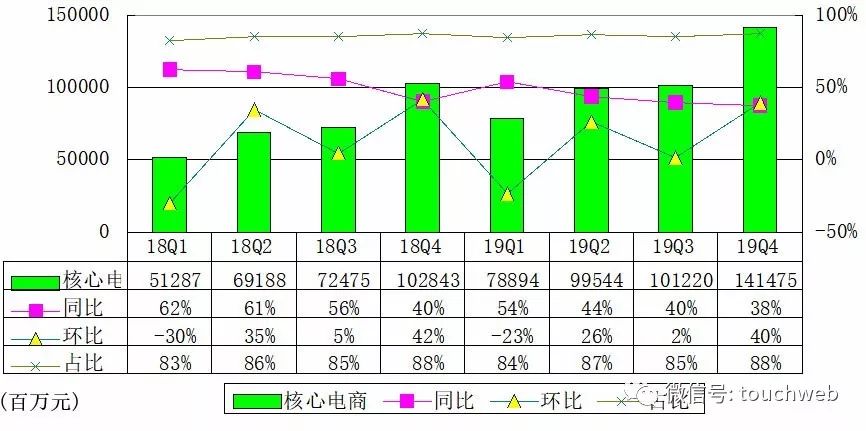阿里巴巴2019年第四季度核心电商营收为1414.75亿元,较上年同期的1028亿元增长38%。