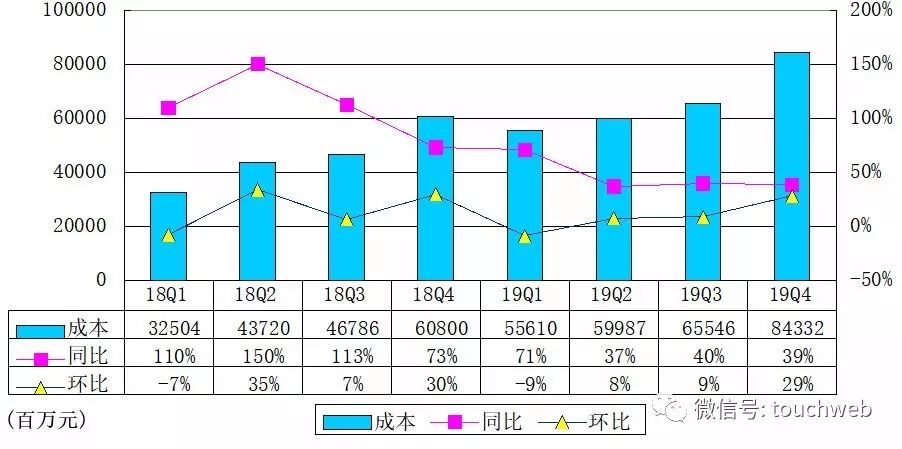 阿里巴巴2019年第四季度成本843.32亿,较上年同期的608亿元增长73%。