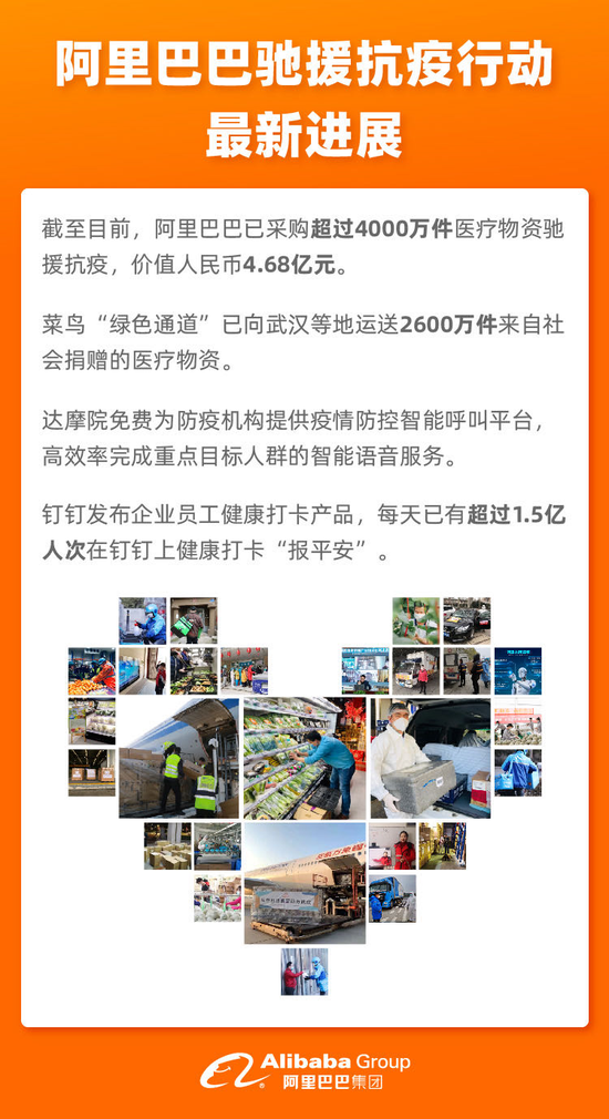 阿里巴巴集团于北京时间2月13日晚准时公布截至2020财年第三季度业绩,在当晚的分析师电话会上,阿里巴巴集团董事会主席兼首席执行官张勇透露了阿里巴巴驰援抗击新冠肺炎的阶段进展:截至目前,阿里巴巴已经采购超过4000万件医疗物资送往武汉及其它受疫情影响的地区,价值人民币4.68亿元;菜鸟绿色通道向武汉和其他受影响地区递送了超过2600万件医疗物资。张勇表示:“让天下没有难做的生意,是阿里巴巴的使命,现在就是检验我们使命坚持的时刻,我们会和所有商家一起,共渡难关,帮助我们的用户,为全社会抗击疫情做更多贡献。”