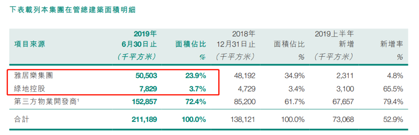 截至2019年6月30日,雅生活服务来自于雅居乐集团、绿地控股的在管总建筑面积分别为50.5百万平方米以及7.8百万平方米,累计占公司在管总建筑面积的27.6%。