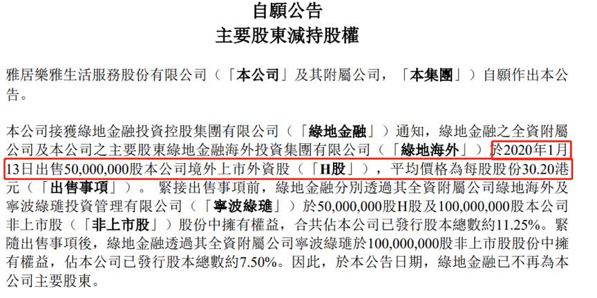 两次减持完成后,绿地金融通过其全资附属公司于1亿股雅生活服务非上市股份中拥有权益,占后者已发行股本总数约7.5%。