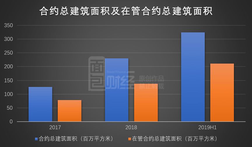 公告数据显示,雅生活服务的合约总建筑面积由2017年底126.1百万平方米上升至2019年中期324.6百万平方米,同期的在管合约总建筑面积由78.34百万平方米上升至211.2百万平方米,两者的增幅均超过1.5倍。