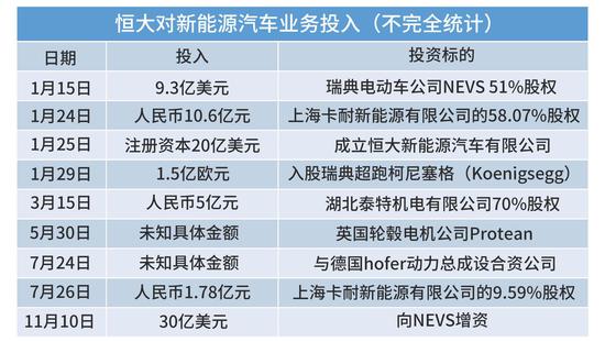 据恒大披露,包括NEVS、Protean、柯尼塞格的入股等,共花费81.7亿元;各大汽车基地土地款的支出约30.6亿;产房机械设备等支出9.8亿;研发费用2.6亿;并购公司收购前的借款业务16亿元。