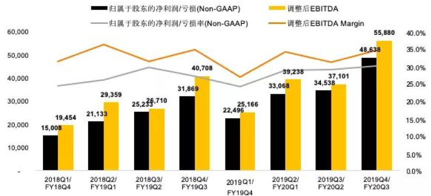 盈利方面,2020财年三季度阿里巴巴归属于普通股股东净利润523.09亿元,同比增长58.3%。非公认会计准则净利润为464.93亿元,同比增长56%。此外,阿里经调整EBITDA利润558.80亿元,经调整EBITDA利润率达到35%,长期维持在高水位。