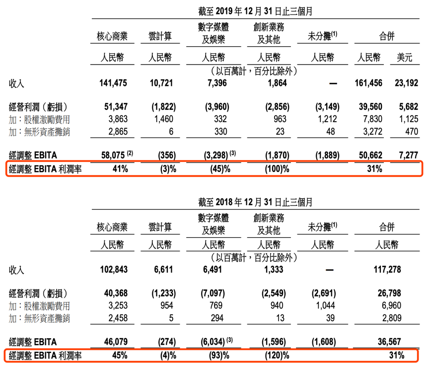 分业务盈利能力角度看,除去核心商业分部,其他三大业务分部目前均录得经营亏损,其中创新业务及其他分部经调整EBITA亏损率最高,亏损额超过该业务的营收。不过,与去年同期相比,云计算、数字媒体及娱乐、创新业务及其他的经调整EBITA亏损率均有所下降,相信在未来规模逐渐扩大后会成为新的增长点。