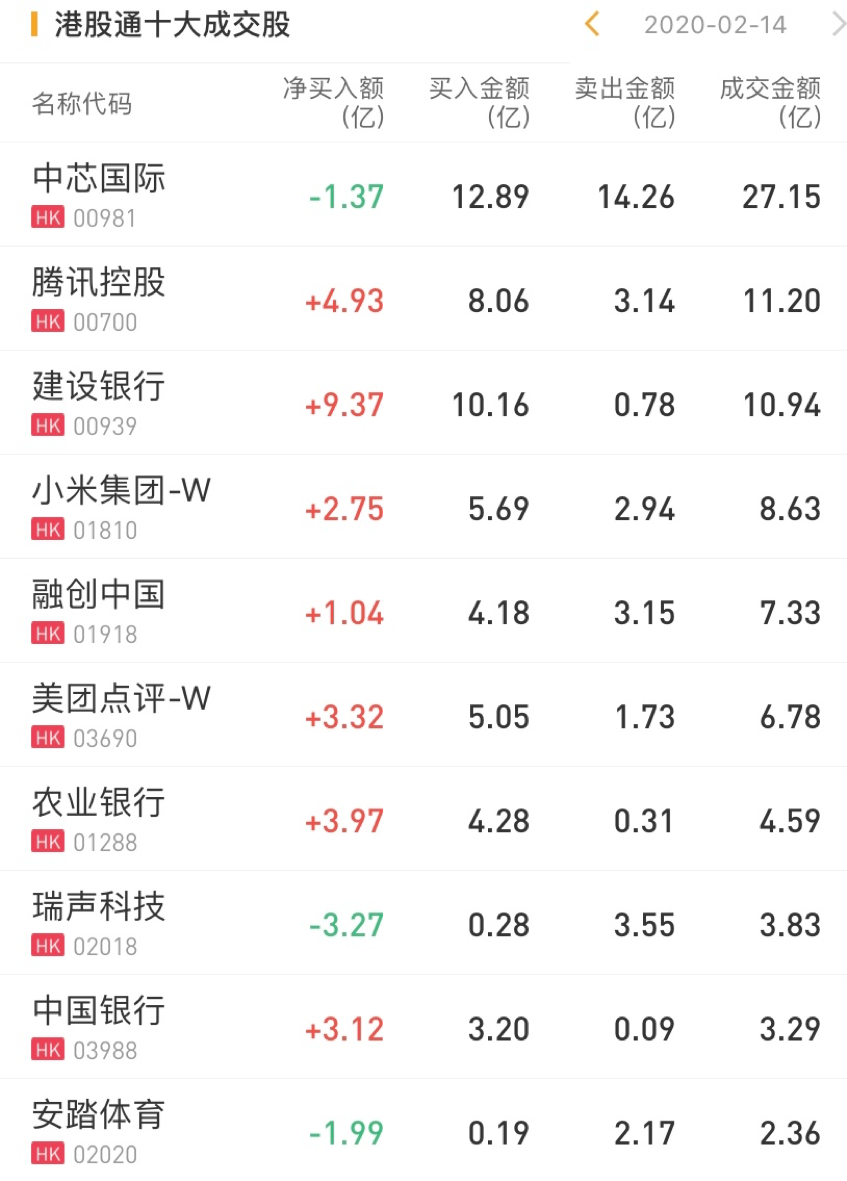 港股通资金今日净流入港股35.57亿港元。今日净买入腾讯控股4.93亿港元,净买入小米集团2.75亿港元,净买入建设银行9.37亿港元,净买入美团点评3.32亿港元。