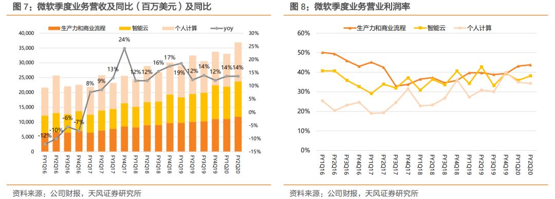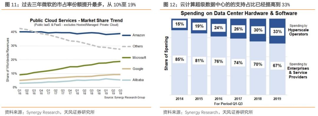 19Q4微软智能云(Intelligent Cloud)板块收入118.7亿美元,同比涨27%,超预期的114亿美元。运营利润率环比提升2.3pct至38.2%,市占率已经从16年初10%提升至19%,是同期份额提升最多的公司。Azure同比涨62%,对比Q3时的59%,维持60%左右的增速。本季微软获得100亿美元JEDI合同但因亚马逊诉讼,合同尚未履行;Salesforce也将采用Azure支持其Marketing Cloud。