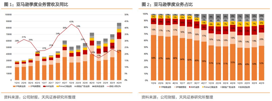19Q4亚马逊AWS收入99.5亿美元,同比涨34%,超预期的98.1亿美元,增速继续下滑,连续三个季度增速低于40%。AWS运营利润26亿美元,同比涨19%,超预期的24.5亿美元,营业利润率26%,较19Q3 25%有所好转。相比微软基于混合云平台+生态的优势,加大对政商大客户的吸纳,AWS增长略显乏力。早几年通过降价保持市占率的模式,不足以打造吸引大企业和政府客户的壁垒。亚马逊16年初至今市占率自40%略跌至39%,对比微软同期市占率自10%提升至19%,谷歌云从5%提升至9%。公司的关键在于占营收10%却贡献67%营业利润的AWS云业务往后的成长性,在受到微软Azure和谷歌云冲击的情况下,即使存在降价空间也会对公司未来盈利弹性产生影响。