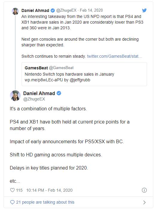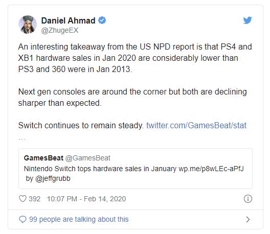 正如Niko Partners的分析师丹尼尔·艾哈迈德所详细描述的那样,在研究最新的NPD报告时,可以看到本世代主机销量降幅要比之前PS3和360大得多。不过任天堂Switch依然保持稳定。当然,这里有几个因素在起作用。