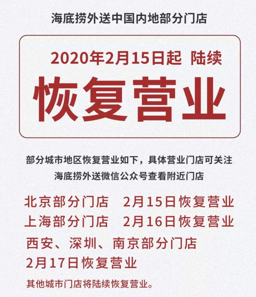 2月15日,海底捞外送官方微信发布信息,即日起,海底捞外送中国内地部分门店将陆续恢复营业,其中北京部分门店2月15日恢复营业,上海部分门店在2月16日,西安、深圳、南京部分门店为2月17日。