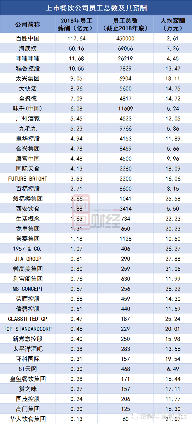 2018年数据显示,百胜中国拥有员工45万人,一年要承担117.64亿元的员工薪酬。主打服务的海底捞拥有员工6.91万人,全年需要支付员工薪酬50.16亿元,人均薪酬达7.26万元。大快活、全聚德、广州酒家等餐饮公司也负担着较高的员工成本,其人均薪酬均在10万元以上。