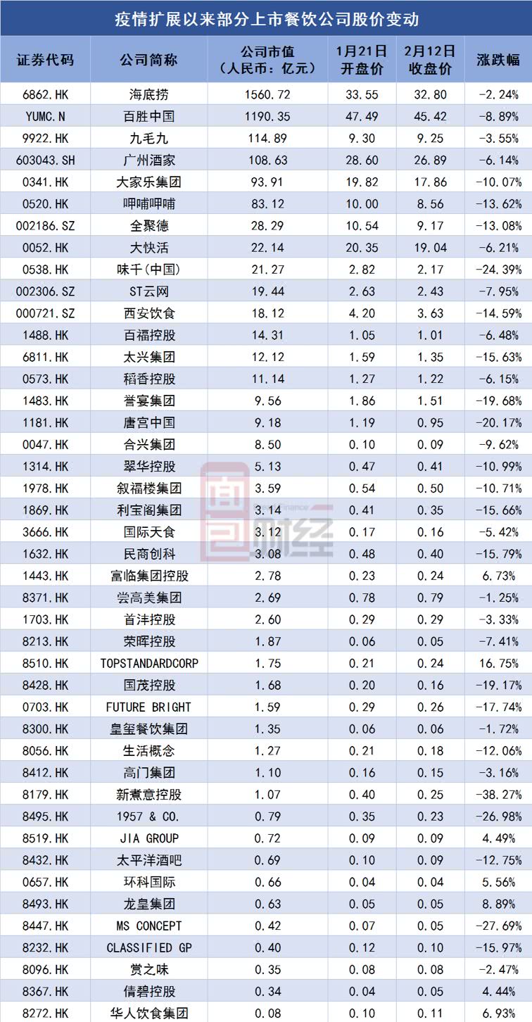 餐饮行业是因疫情最受重创的行业之一。上市餐饮公司股价普遍走跌。停业期间,在丧失现金流来源的情况下,餐企仍需要承担人力成本和租金成本两大刚性支出。双重压力之下,餐企可能还要面对为应对春节消费高峰而“囤货”所带来的大量食材损失。