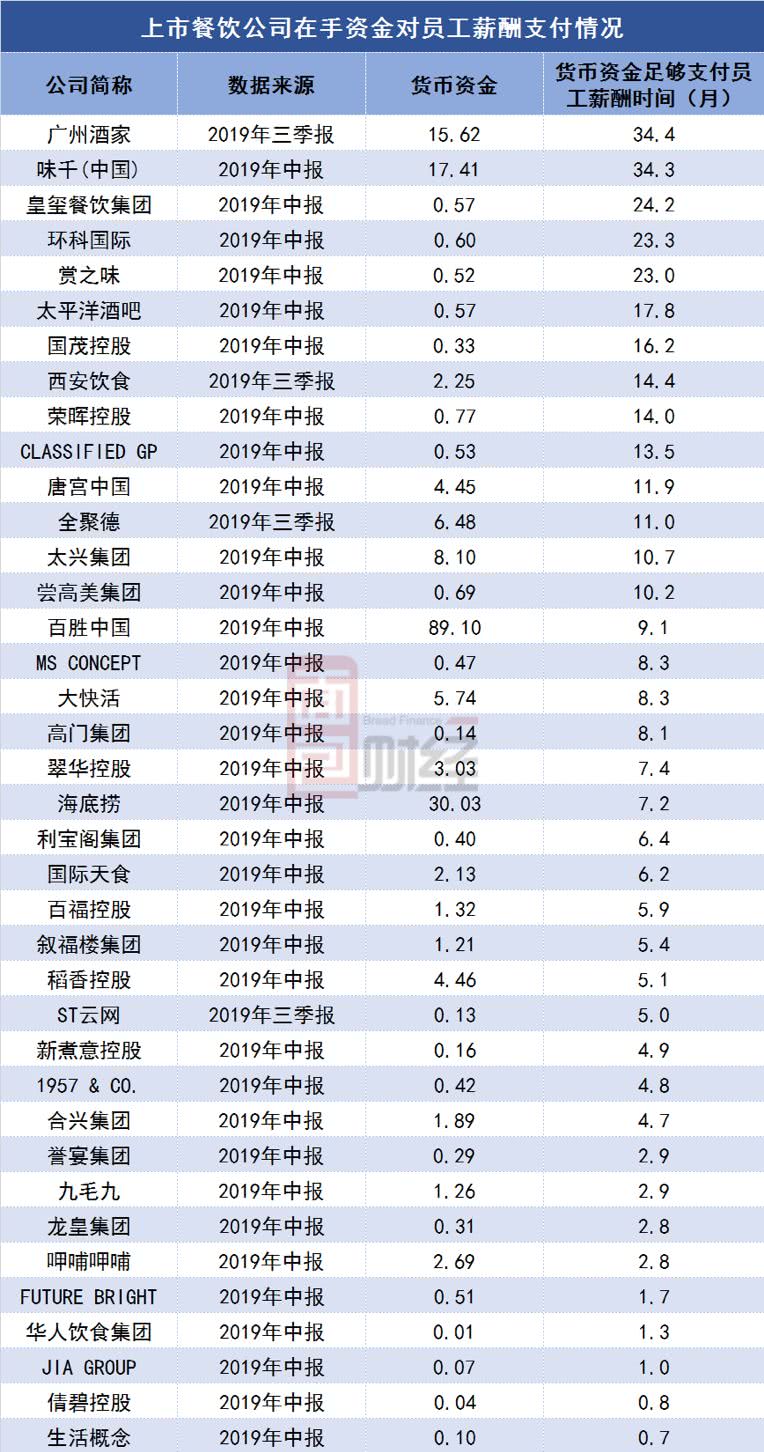 西贝创始人贾国龙公开表示,“账上现金抗不过3个月,2万多名员工待业”。根据数据统计,部分上市餐企的货币资金足够支付员工薪酬的时间也不足3个月,这其中就包括呷哺呷哺和上市发行之前的九毛九。