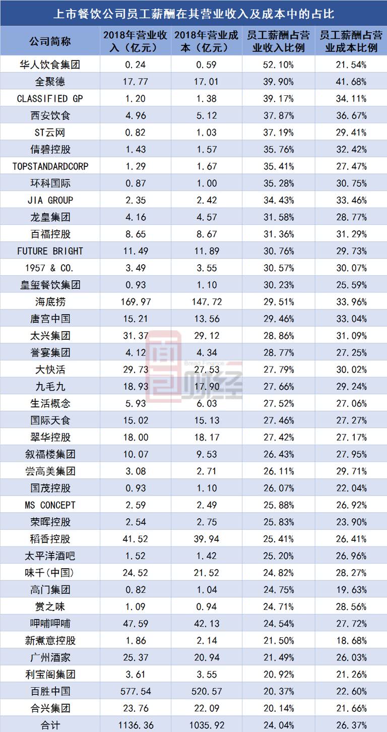 其中,全聚德和西安饮食的员工薪酬占营业收入的四成左右,海底捞和九毛九的员工薪酬占比在三成上下。拥有肯德基,必胜客、东方既白等众多品牌的百胜中国凭借其规模效应将员工薪酬占营收的比例控制在20.37%。
