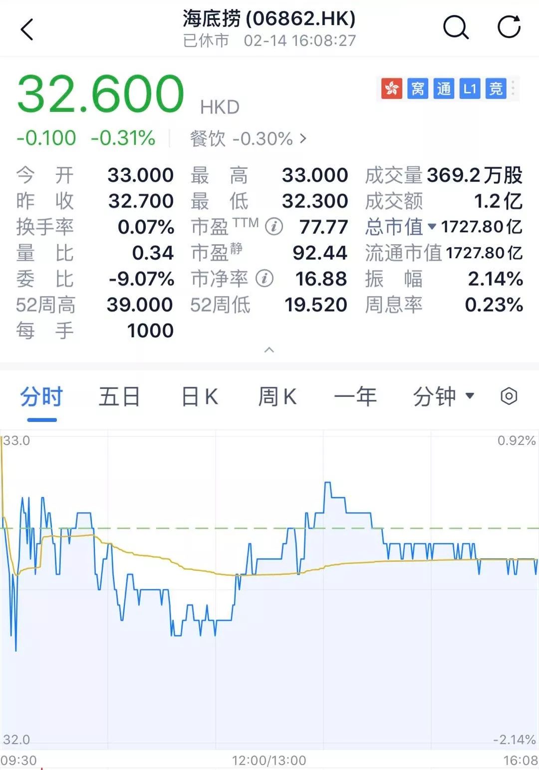 截至2月14日收盘,海底捞股价为32.6港元,下跌0.31%。