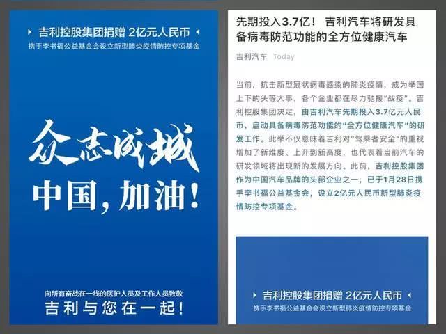 疫情是一面镜子,它照出了不作为者的民心所向,也照出了中华民族的温情与大爱。于汽车行业而言,从吉利第一时间设立2亿元专项基金,调动全球资源采购医疗物资、捐赠158台抗疫用车解决当下问题,到投入3.7亿元研发健康汽车、推出更健康的汽车产品解决长远需求,疫情的另一面是吉利汽车强大的社会责任感、强大的研发实力,和“以用户为中心”、全力满足消费者需求的坚定决心。