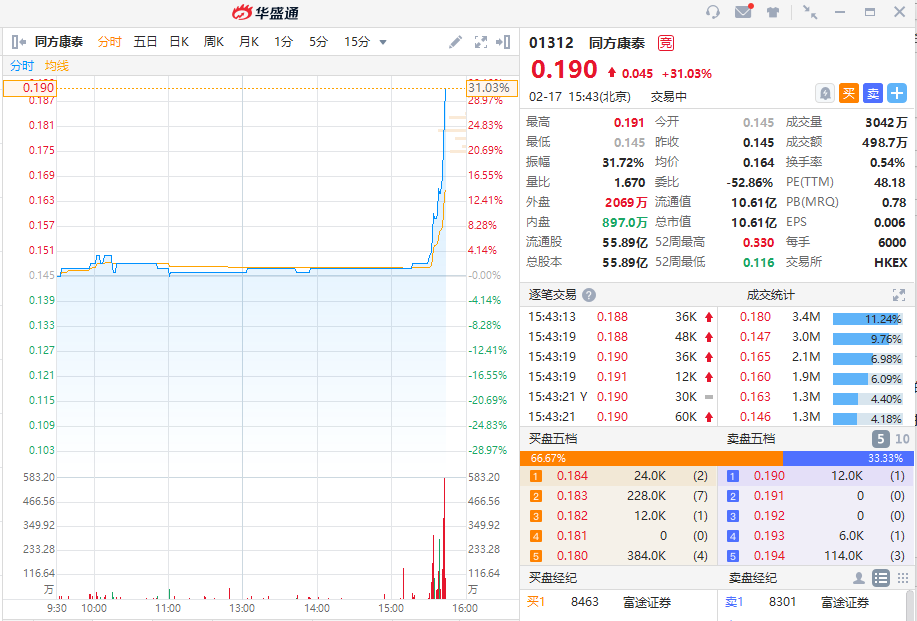 消息公布后,港股相关公司同方康泰01312.HK直线拉涨,截至发稿,涨超30%。
