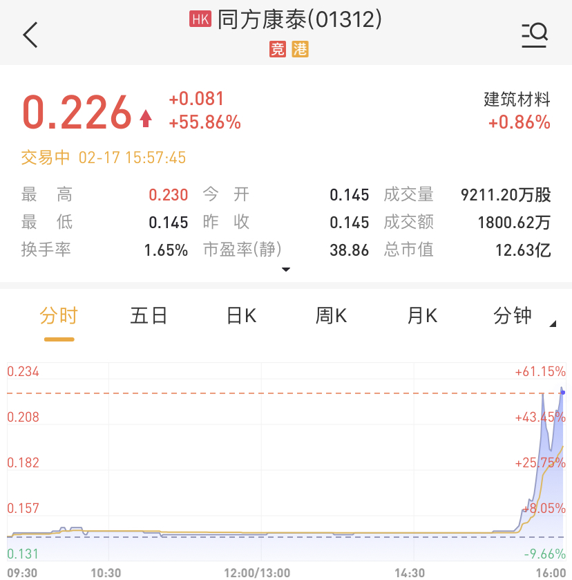 华盛资讯2月17日讯息,同方康泰(01312)盘中异动,股价正在直线拉升。截至发稿,同方康泰大涨55.86%,现报0.226港元每股,当前成交量9211.20万股,成交额1800.62万港元,换手率为1.65%,当前总市值为12.63亿港元。