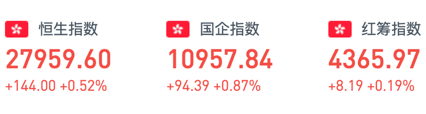 昨日,恒生指数开盘跌0.18%,盘初直线拉升,随后维持窄幅震荡至收盘。截至收盘,恒生指数涨144点或0.52%,报27959.6点,全日成交额达950.04亿。国企指数涨0.87%,报10957.84点,红筹指数涨0.19%,报4365.97点。