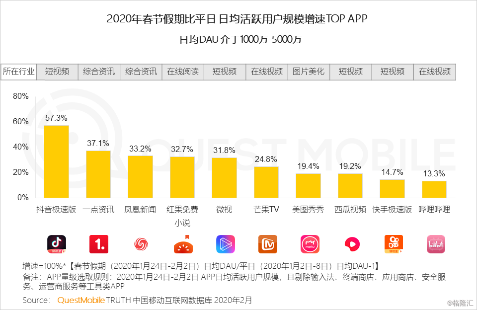 3、从用户规模增长来看,用户在春节期间的需求主要集中在泛休闲娱乐、社交、资讯、社交等相关行业