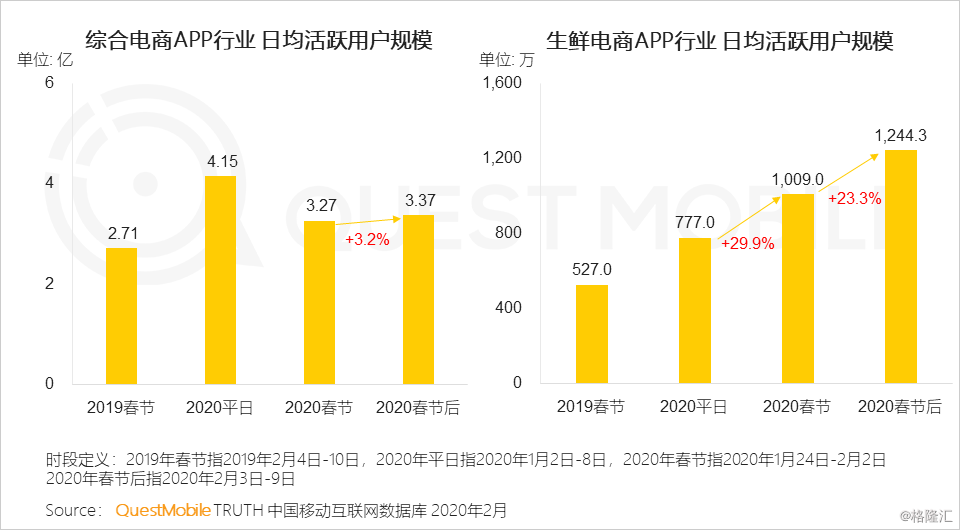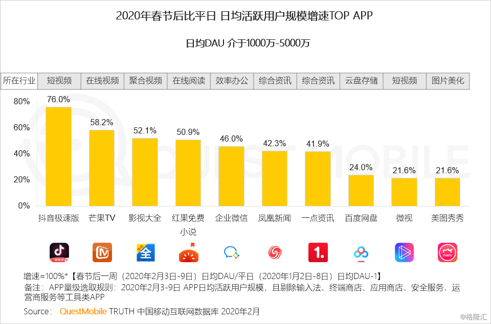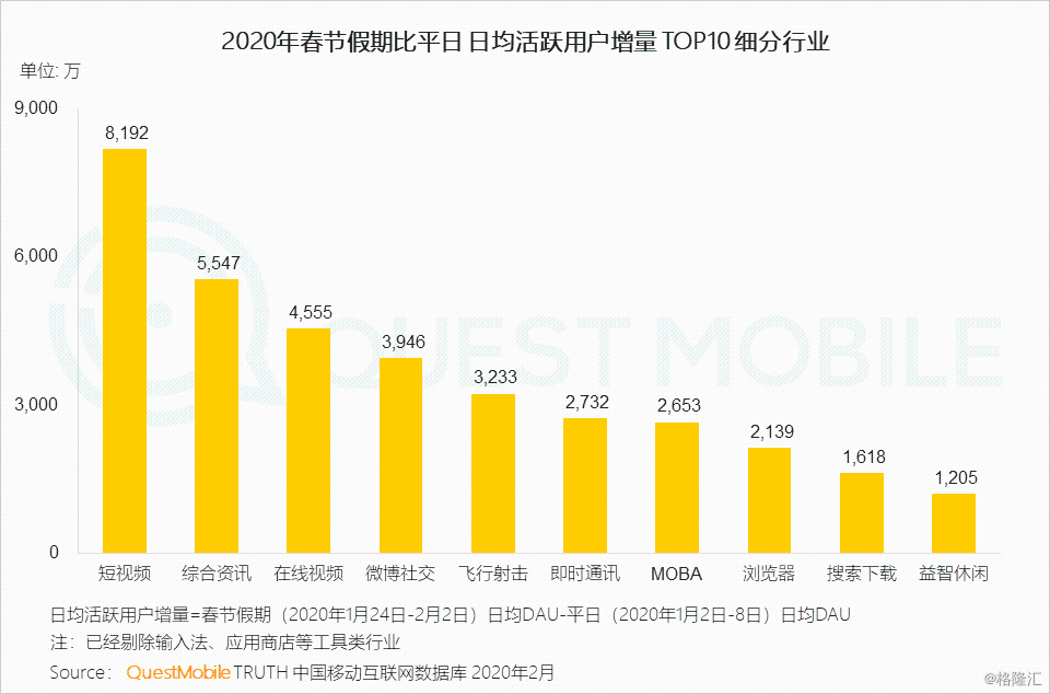 各位童鞋逮嘎猴啊,上期“战疫报告第一期”看的咋样?很多童鞋后台留言,着急要看办公啊、学习啊、电商啊、OOXX啊等等领域数据(⊙o⊙)…美女们这么猴急、这么热情,大过年的,搞得Mr.QM都有点不好意思了为了不让大家那么渴望,接下来,Mr.QM会陆续跟大家分享一下移动互联网各个领域和方向上的“战疫”情况,让大家看到过瘾!当然,在这个全国上下齐心“战疫”的关键时刻,还是祈愿大家平安、康乐!疫情的持续影响正在显现,QuestMobile数据显示,春节假期之后,由于远程办公、学习的需求上升,人均使用时长进一步增加了30分钟飙涨至7.3小时(2019年春节5.6小时、2020年平日6.1小时,2020年春节6.8小时),马上要突破8小时工作制大关了!这当中,效率办公日均活跃用户规模上涨了近4000万,在线视频、K12分别上涨了2400万左右。同时,APP使用数量也增多了,春节后日均APP使用个数超过了9.5个。具体来看,春节期间,用户规模增长率最大的主要是休闲娱乐、社交和新闻资讯,增长率TOP榜来看,DAU亿级以上阵营里,前五位分别是QQ浏览器、微博、爱奇艺、快手、今日头条;DAU5000万到1亿阵营里,前五位分别是新浪新闻、和平精英、王者荣耀、优酷视频、腾讯新闻。春节假期后一周,用户规模增长最快的是办公、浏览器、教育等领域,增长率TOP榜来看,DAU亿级以上阵营里,前五位分别是QQ浏览器、爱奇艺、今日头条、微博、快手;DAU5000万到1亿阵营里,前五位的分别是和平精英、新浪新闻、钉钉、王者荣耀、优酷视频。总结各领域的增长状况,可以发现,2020春节前后增长方式存在几种显著的方法论:首先是场景重塑,包括办公、商务、教育需求,明显向下沉用户扩展了,商务用户人群活跃时段也从早10点持续到晚8点,基本没有太多低谷;其次是生活服务和防护用品,生鲜电商日活用户从平日的不到800万,在春节期间突破了1000万,节后再次突破1200万;第三,跨界合作再次得到印证,短视频平台与央视、卫视春晚的合作,《囧妈》对西瓜视频的推动,等等,拉动效果明显。