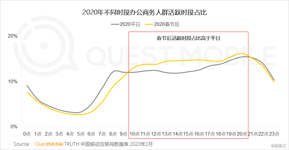 Ⅲ 在家办公的用户每天10小时精神饱满,从早十点到晚八点,活跃占比明显高于平日