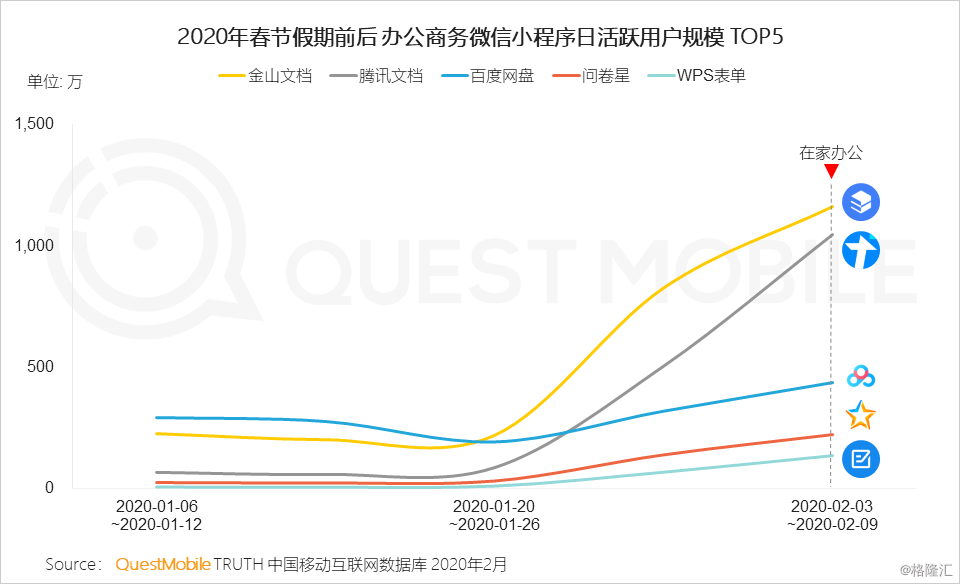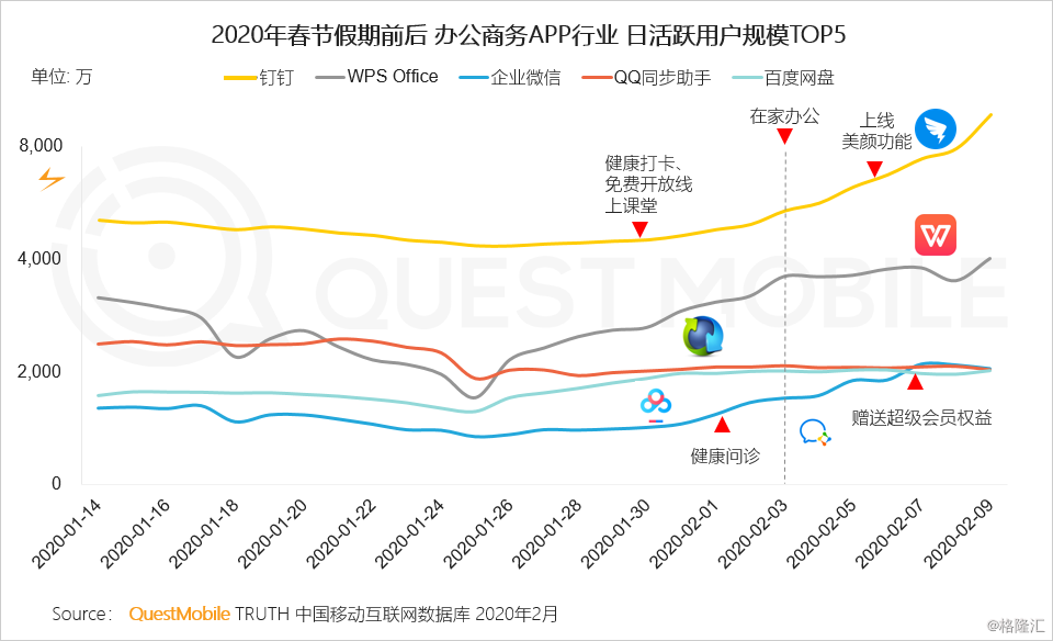 Ⅰ春节假期后,职场人士开始在家“云办公”,拉动办公商务行业用户规模增长,钉钉、微信会议等产品扩容和免费政策进一步降低使用门槛、提升用户粘性