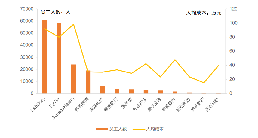相比于其他国家,我国化学人才成本处于较低水平:2018 年美国人均 GDP 为 6.26 万美元,本土 CRO 企业具有更高的成本优势。从人均营业成本来看,三家国际 CRO 龙头均在 80 万元/人/年以上,而国内各家 CRO 企业人均成本明显较低,其中药明康德、康龙化成、泰格医药的分别为 31、30、35 万元每人。单从人均成本看,国内 CRO 企业的成本大大低于国外CRO 企业。