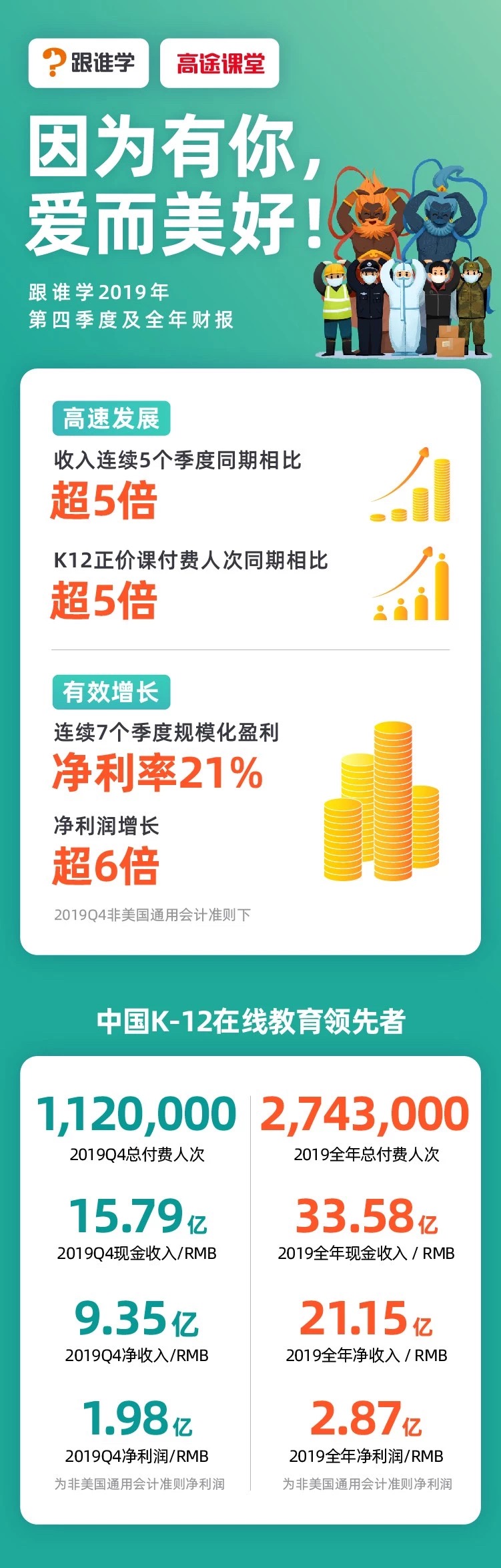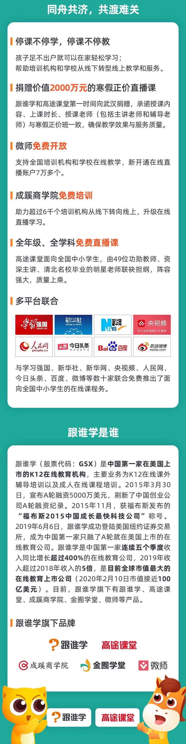 2月18日,跟谁学 $GSX 发布了2019年第四季度财报及全年业绩快报。过去的一个月,跟谁学发挥在线教育的优势和力量,通过提供免费直播课等多项措施,为抗击疫情尽力。