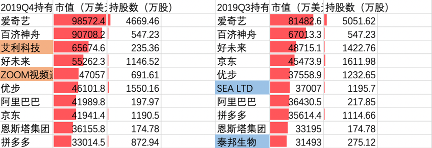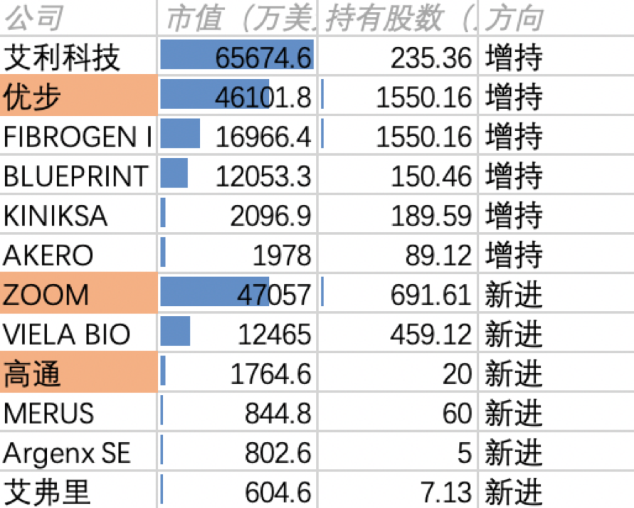 前十大重仓股方面,艾利科技和ZOOM视频通讯取代了上季度的SEA LTD和泰邦生物,成为新的前十大重仓股组合。
