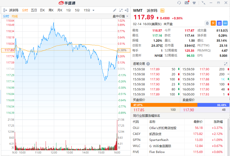 沃尔玛股价上周五收盘上涨0.38%,至117.89美元。该股在52周内的交易价格一直在95美元至125.38美元之间。