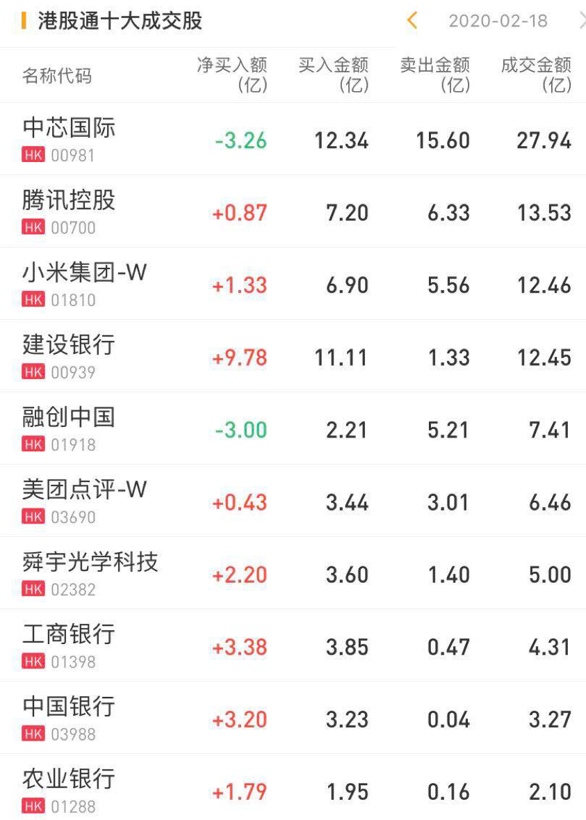 今日净买入腾讯控股0.87亿港元,净买入小米集团1.33亿港元,净买入建设银行9.78亿港元,净买入舜宇光学科技2.20亿港元。