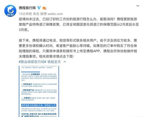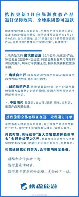 【TechWeb】2月18日消息,携程官方微博发文称,更新旅游度假产品特殊退订保障政策,已将全球跟团游无损退订的保障范围从2月底延长至3月底。