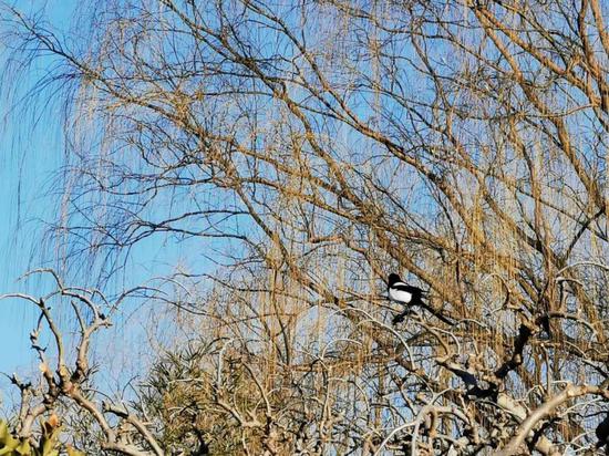 今天的北京依然晴朗,天气进一步转暖,冰雪融化,阳气上升。天空中居然已经有候鸟飞过。它们带来的不只是春天的消息,还有我们的希望。散步时,看到喜鹊在已经泛黄的柳树枝头鸣叫,动作轻盈、声音欢快,让人一消愁容。