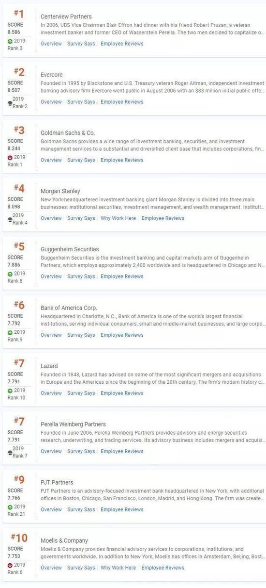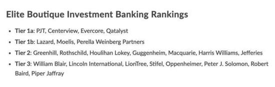 当然,精品投行之间也有Tier1,2,3,各家的排名也众说纷纭,WSO 点评的 Elite Boutique 排行算是获得比较多人的认可: