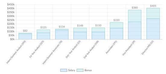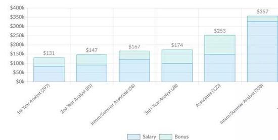 九大投行中 1st Year Analyst 的平均薪资为$125,000,3rd Year Analyst的平均薪资为$148,000,2nd Analyst的薪资会有略微的上涨。Associate 的平均薪资为$222,000。