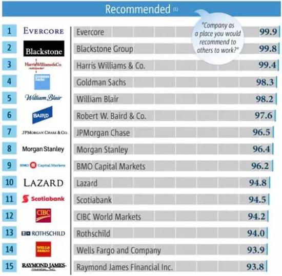 Evercore被Wall Street Oasis评为全美最值得推荐工作的投行,原因是:公司处于成长期,公司薪酬、文化氛围都比较好,个人能够得到较好的发展。