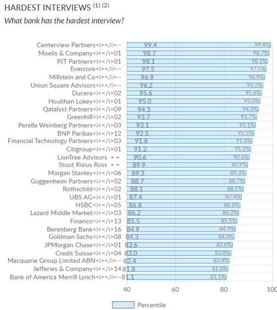 根据WSO发布了投行面试难度排名,前几名都是精品投行:
